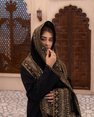 Black Mystique is a masterpiece of timeless design, featuring a full-sleeves long shirt adorned with intricate golden embroidery along the hem and neckline, creating a stunning contrast against the rich black fabric. The straight trousers are tailored to perfection, with delicate embellishments that harmonize beautifully with the ensemble, making Black Mystique an embodiment of elegance and allure.