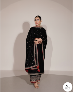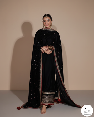 Black Imperial by Noor E Adan is a statement of pure elegance — designed for the woman who embraces luxury with confidence and grace. Crafted from premium winter viscose, this striking black ensemble is adorned with exquisite maroon and golden embroidery, creating a regal look that stands out effortlessly.