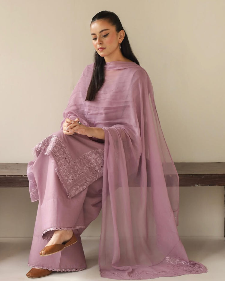 Dusty Lavender | 3-Piece Stitched Embroidered Outfit – an expression of soft elegance and modern sophistication. Crafted from premium Dhanak fabric, this ensemble offers a warm yet lightweight texture, ensuring comfort and luxury in every detail. The gentle dusty lavender hue exudes feminine charm and serenity, making it perfect for both festive and semi-formal occasions.